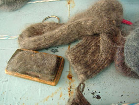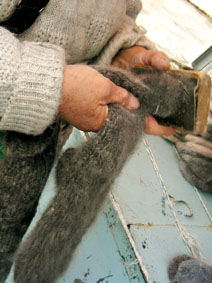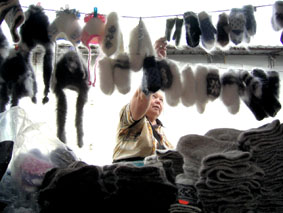 お隣のお店にも潜入。おばあさんが外に出て商品を並べています。 モコモコにしたミトンを吊るしているところ。
